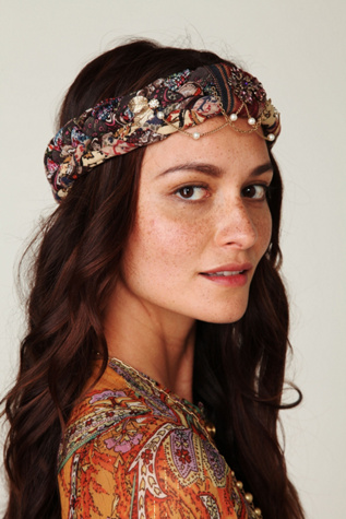 Headressing created from braiding blends of repurposed and mill end cottons linens and silks. Accented with carefully composed assemblages of vintage jewelry, beads and chains.